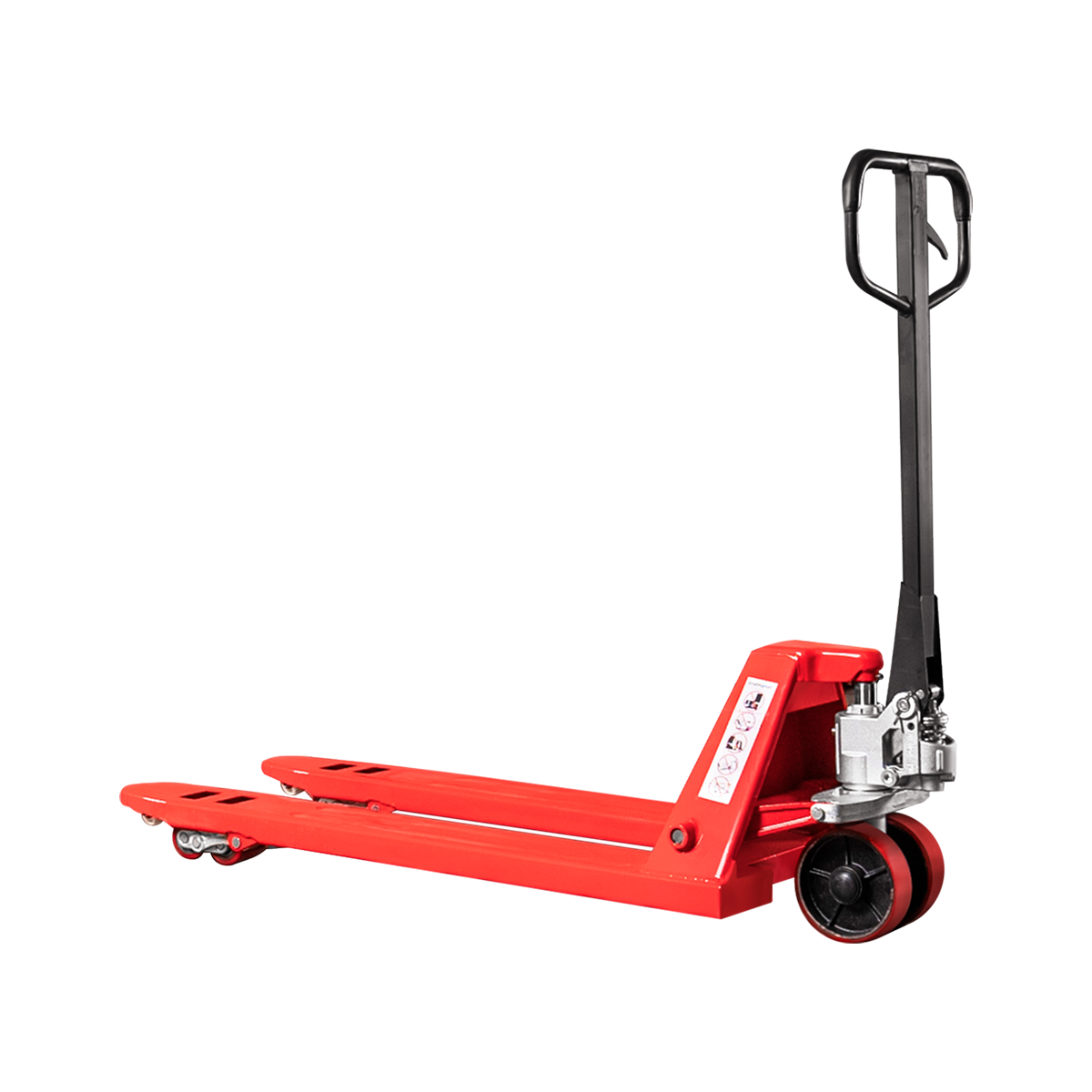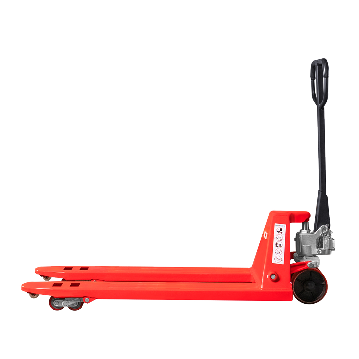 Вилы тележки выполнены из качественной толстолистовой стали с порошковой окраской, а опора передних сдвоенных колес изготовлена методом литья. Цельнолитой корпус масляного насоса, хромированный поршневой шток и стержень клапана исключительно надежны и рассчитаны на длительный срок службы. Защитный перепускной клапан срабатывает при превышении нагрузки на 20%, исключая повреждение гидроцилиндра.